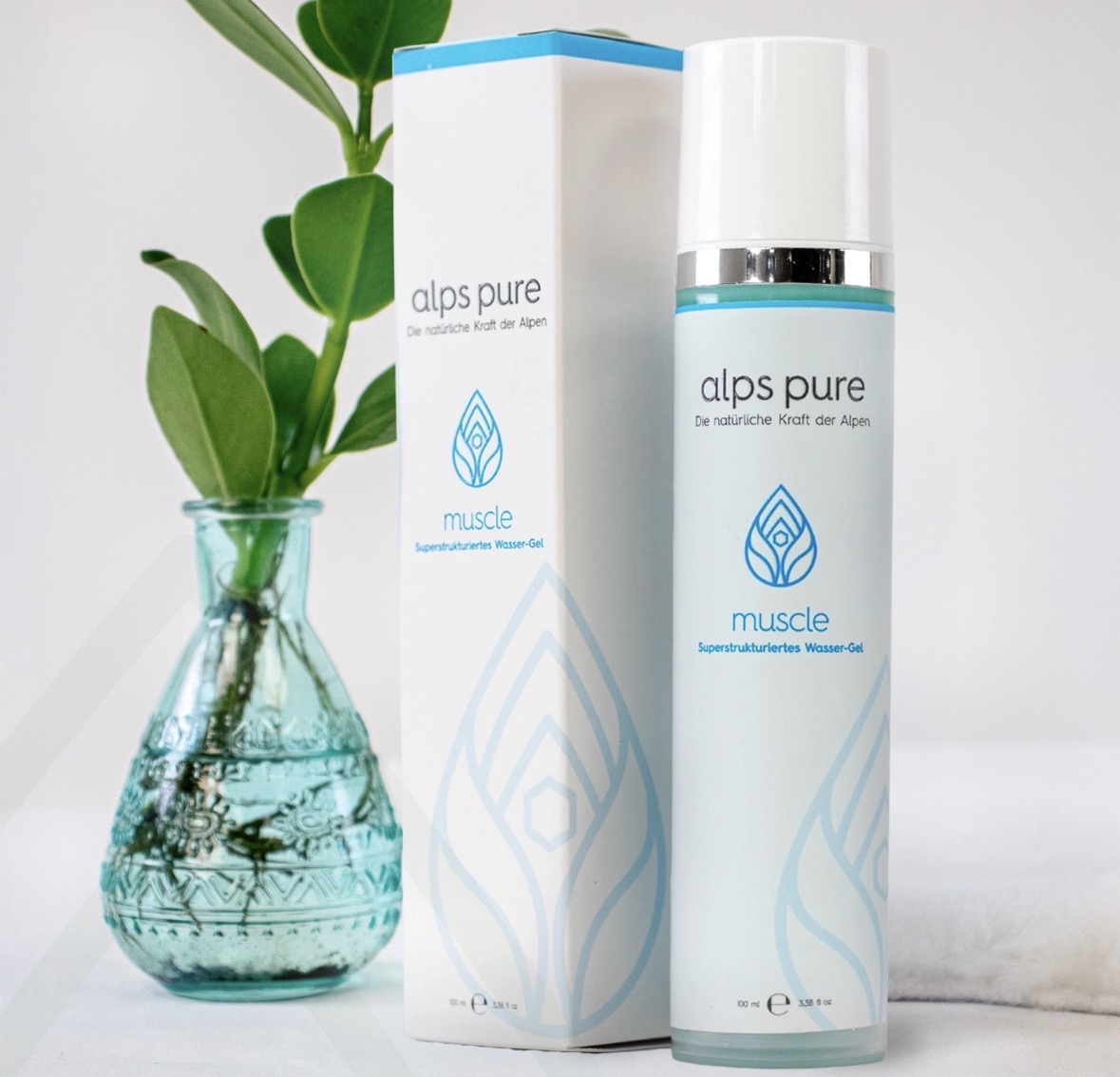 alps pure muscle ist ein spezialisiertes superstrukturiertes Wasser-Gel, das auf Basis eines gelartigen, hexagonalen Wassers entwickelt wurde. Es kann bei Muskelkater, Wadenkrämpfen, Prellungen, Blutergüssen sowie Verletzungen von Faszien, Sehnen und Zerrungen unterstützen – kombiniert mit der wohltuenden Wirkung von Arnika-Essenz.